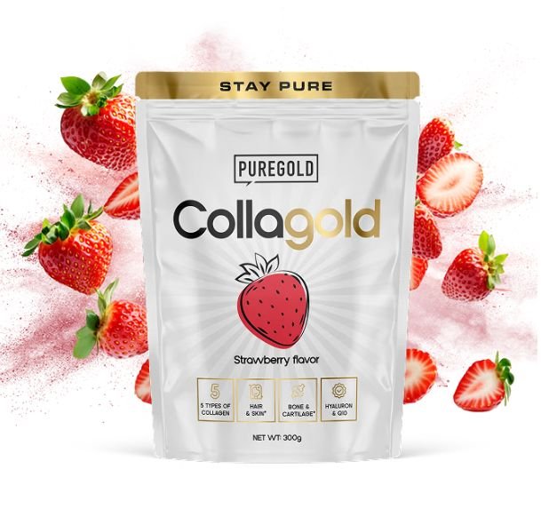 Puregold Collagold ist ein Getränkepulver aus hydrolysiertem Rinderkollagen mit Zusatz von Vitaminen, Zink, Selen und Süßungsmitteln.
