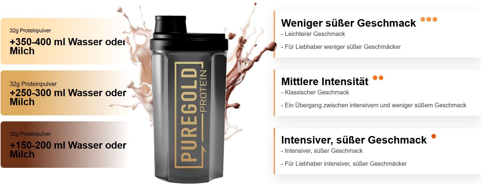 Mische 1 Portion (ca. 30 g) mit 200–300 ml Wasser oder Milch.